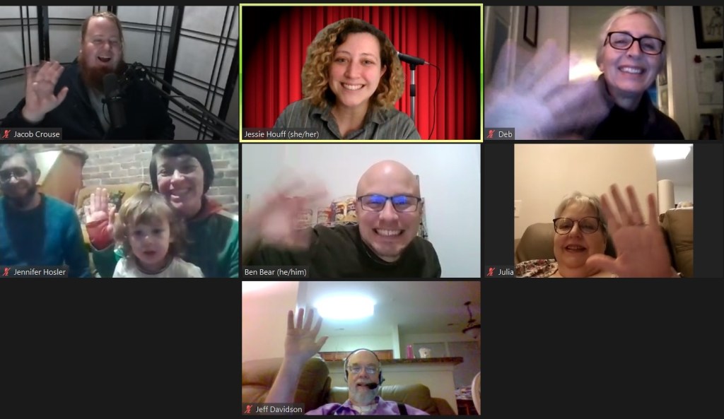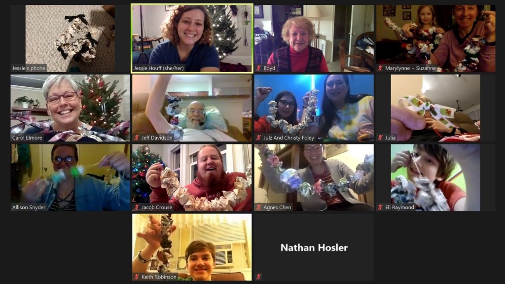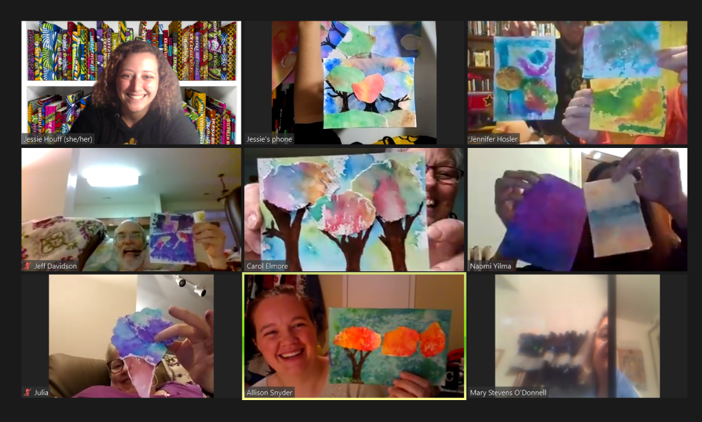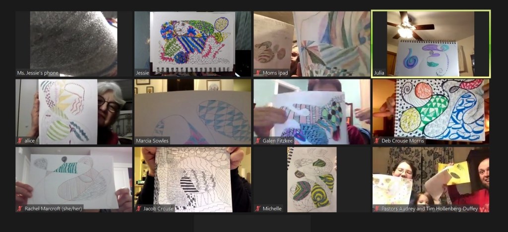 During Jessie Houff’s employment at Washington City as the Community Arts Minister, the Arts Ministry hosted a virtual Art Night via Zoom. They were hour-long evening artmaking sessions Jessie or a guest artists. Each month, participants were led in a variety of simple art projects anyone can do from home using things you have lying around the house. See the pictures to the right of some projects we made together!
